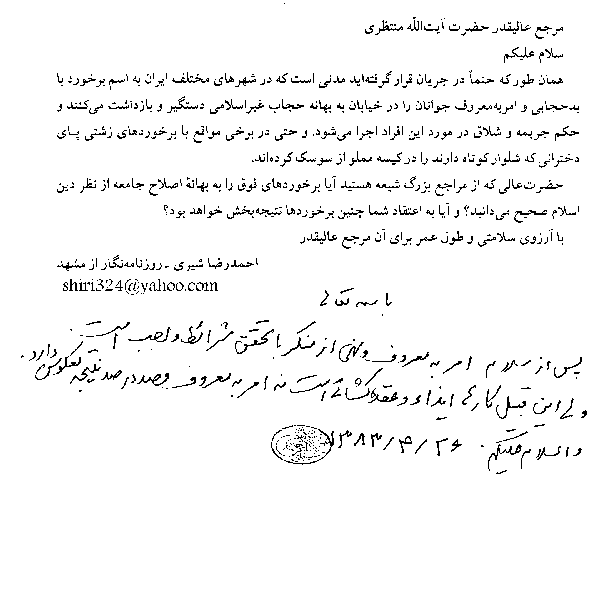 آیت الله منتظری در پاسخ به سوالی در مورد امر به معروف و نهی از منکر در دین اسلام و آنچه اکنون بدین عنوان انجام میشود چنین پاسخ داد: