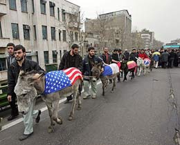 اآنهائی که کنار الاغ های مزین به پرچم امریکا و در صف های عقب تر، پرچم انگلیس و دانمارک و آلمان حرکت می کنند، از تیم های استشهادیون بسیج و فدائیان نواب صفوی اند. قرار است امریکا از این نمایش ها بترسد و ایران را بمباران نکند! مبارزه با امپریالیسم امریکا به اینجا کشید. وقتی سمبل انقلاب می شود نواب صفوی و انقلاب کوبا و نیکاراگوئه می شود انقلاب شیطانی، سمبل انقلاب در جمهوری اسلامی هم باید بشود همین که می بینید. سخنرانی عباسی را در همین شماره پیک نت با دقت بخوانید. اینها شاگردان او هستند!