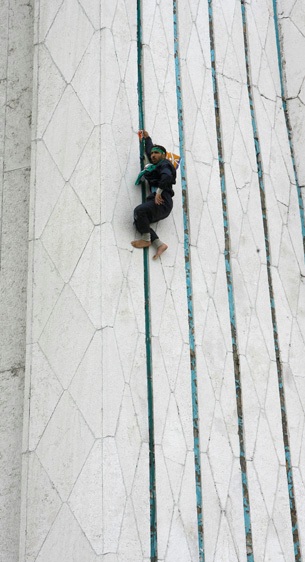 عکس از صحنه گیر کردن بسیجی در نیمه راه فتح برج آزادی