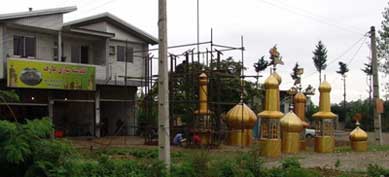 در 3 سال گذشته، هزاران کارگاه گنبد سازی و گدسته سازی در سراسر ایران راه اندازی شده است که برای مساجد و امام زاده ها و سقاخانه های جدید و برای تعمیر قدیمی ها گلدسته و گنبد می سازند. به اشکال و اندازه های مختلف. این عکس ها مربوط به این کارگاه ها در یک مسیر فریدونکنار و قائم شهر است. این کارگاه ها مدل ها و نمونه هائی را ساخته و همانطور که می بینید برای تبلیغ در معرض تماشا گذاشته اند. بنابراین، آنچه رهبر جمهوری اسلامی می گوید، در این سه سال با هدایت و کمک دولت و راه افتادن کارگاه های کوچک و نیمه بزرگ تدارک دیده شده بود. با این سخنان رهبر لابد از این پس هر کس که کسب و کارش راکد می شود و ورشکست می شود، محل کسب خود را تبدیل به محل ساخت همین نوع کارگاه ها و همچنین سپر و کتل و قمه و شمشیر و زره تعزیه و در و پنجره سبک امام زاده ها و.... خواهد کرد