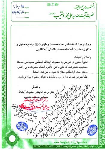 دستخط آیت الهی که "ولدان" او را فریب داده و امضایش را علیه آیت الله دستغیب گرفته بود.