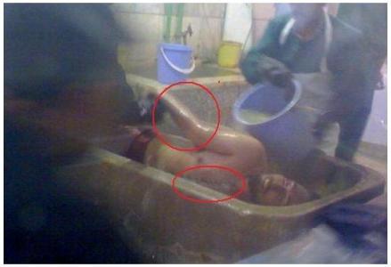 این عکس پیش از خاکسپاری سهراب اعرابی وهنگام شستشوی او گرفته شده است. دست راست او شکسته است و سینه اش شکافته! شکستگی دست یعنی که بعد از دستگیری شکنجه شده و شکافتگی سینه یعنی این که به یک بیمارستانی منتقل شده است. و یا با دوختن سینه او خواسته اند اینطور وانمود کنند که در بیمارستان فوت کرده است.