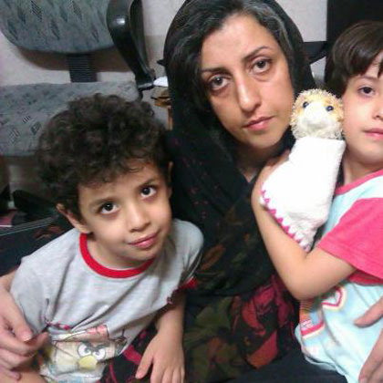 این نرگس محمدی است، در کنار دو فرزندش. موقتا از زندان کودتای 22 خرداد بیرون آمده است. او را با وثیقه رها کرده اند تا هر زمان که اراده کردند دوباره احضارش کنند. جرم او شرکت در بنیانگذاری کانون مدافعان حقوق بشر در ایران است! وقتی بشر در حکومت کنونی و ولایت آقای خامنه ای ارزش و اعتبارش را از دست داده، مدافع حقوق آن سرنوشتی بیش از این می تواند داشته باشد؟ چهره در هم کوبیده شده نرگس محمدی خود می گوید که دفاع از حقوق اولیه انسان در ایران چه بهائی دارد.