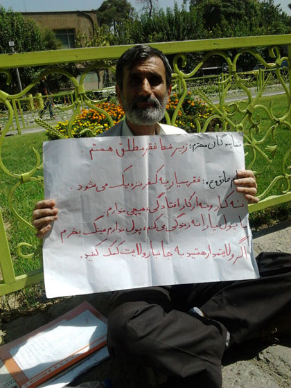 او که این نوشته را در دست دارد جانباز جنگ ایران وعراق است. ظاهرا در زندگی به خاک سیاه نشسته و حالا مقابل در ورودی مجلس با همین نوشته روی زمین نشسته است تا هم مردمی که عبور می کنند و هم آنها که بنام نماینده مردم برده اند مجلس ببینند ملت در چه حال و روزی است. مردم ببینند بر قربانیان جنگ قبلی چه رفته است تا آینده خویش را در جنگی تازه حدس بزنند!