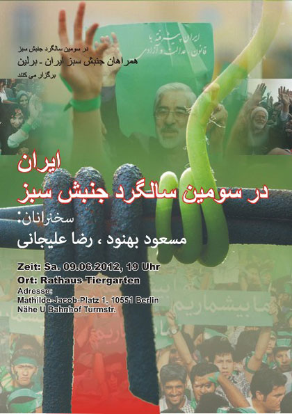در سومین سالگرد خیزش سبز مردم ایران که در پیوند است با نتیجه اعلام شده انتخابات ریاست جمهوری 22 خرداد 1388، در پایتخت آلمان "برلین" همایشی برگزار می شود که در آن مسعود بهنود و رضا علیجانی سخنرانی خواهند داشت. این همایش که برگزار کننده آن "همراهان جنبش سبز ایران- برلین" است، شنبه 9 یونی ساعت 19 در محل شهرداری تیرگارتن برلین برگزار می شود.