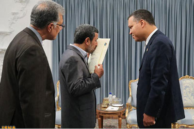 این عکس، یکی از آخرین دلقک بازی های احمدی نژاد قبل از تحویل دادن دولت به حسن روحانی است. سفیر ونزوئلا استوارنامه خود را تحویل باصطلاح رئیس جمهور داده و مبهوت حرکات و نمایش های احمدی نژاد برای بوسیدن استوارنامه است. آقای خامنه ای نام این اداها و دلقلک بازی ها را گذاشت زنده کردن شعارهای انقلاب و احمدی نژاد نیز کشوری ویران را برای حسن روحانی و ملت ایران باقی گذاشت.