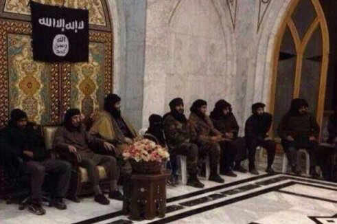 این عکس را خبرگزاری های خارجی تحت عنوان "البغدادی" رهبر "داعش" در مقر خلافت و در کنار یارانش منتشر کرده اند. ظاهرا آن که زیر شعار لاالله الا الله نشسته باید البغدادی باشد و همگی به دوربینی که از آنها عکس گرفته خیره اند.