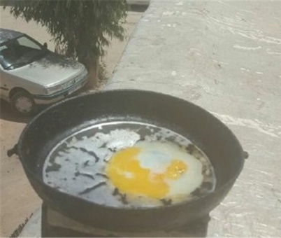 گرمائی به کرمانشاه رسیده که تا کنون سابقه نداشته است. این گرما هر چه از شهر کرمانشاه به طرف مرز عراق می روی شدید تر می شود، چنانکه در قصرشیرین و خسروی که نزدیک مرز عراق اند  به 48 درجه می رسد. یکی از فعالان فضای مجازی در قصرشیرین، عکس بالا را منتشر کرده است. یعنی ماهیتابه ای را زیر آفتاب گذاشته و در آن تخم مرغ شکسته تا نیمرو شود که شده است! شاید کار به جوجه کباب در زیر آفتاب هم بکشد که در اینصورت بعید است کسی از خانه اش بیرون بیاید تا جوجه کباب زیر آفتابی بخورد که ممکن است خودش را هم کباب کند و بشود "آدم کباب"!