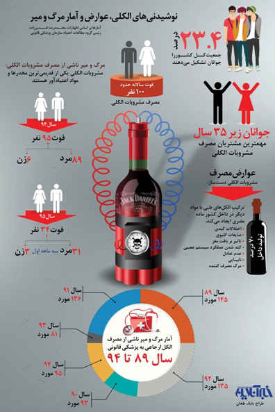 به این "اینفورگرافیک" که تحت عنوان عوارض و تلفات سالانه مصرف مشروبات الکلی در جمهوری اسلامی منتشر شده نگاه کنید. دلیل این مصرف بالای الکل در ایران را همه میدانند و پیش از همه خود حکومت میداند اما فلج سیاسی و مذهبی اجازه نمیدهد راه کارهای واقعی برای جلوگیری از آن و یا کمتر شدن آن پیدا و اجرا شود. با شلاق و تکفیر و اعدام هیچ مشکلی در طول تاریخ حل نشده است. چنان که در جمهوری اسلامی نشد. نه فحشا حل شد، نه اعتیاد به مواد مخدر، نه مصرف و اعتیاد به الکل، نه سرقت و نه قتل و جنایت و نه هیچ مشکل دیگری. صد حیف که آمار نیست تا مشخص شود چند برابر دوران پیش از انقلاب در ایران مشروب الکلی نوشیده می شود.