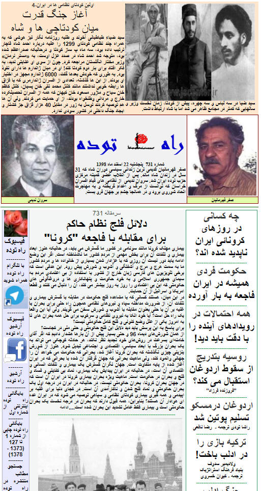 هفته نامه راه توده – شماره 731 (پنجشنبه 22 اسفند 98)- منتشر شد و مطالب آن علاوه بر سایت این نشریه، روی فیسبوک و تلگرام راه  توده نیز قرار گرفت. سرمقاله این شماره اختصاص به  تحلیل بحران سیاسی- حکومتی کرونا دارد. بخش چهارم کودتای نظامی ها در سال 1299 علیه احمد شاه قاجار به رهبری یک طلبه جوان اما با سواد و باهوش بنام سید ضیاء الدین طباطبائی دراین شماره منتشر شده است. در همین شماره مطالب دیگری می خوانید با عناوین زیر:  چه کسانی در این روزهای بحران کرونائی در ایران ناپدید شده اند؟، حکومت فردی همیشه در ایران فاجعه به بار آورده است، همه احتاملات در رویدادهای آینده را با دقت بایددنبال کرد، روسیه بتدریج از سقوط اردوغان استقبال می کند؟، ترکیه بازی را در ادلب باخت، جنگ ادلب فرصتی تازه برای رسیدن مهاجرین ایرانی به اروپا، آغاز جنگ نفتی میان دو غول نفتی مسکو و ریاض، پوتین برسر دو راهی انتخاب راه یلتسین یا لنین و استالین، گرونا گریبان اقتصاد لیبرالیستی جهان راگرفته، تجلیل از نازی ها در اوکرائین، گورباچف رهبری که تاریخ قضاوتی تلخ درباره او می کند و بالاخره انتقادهای چه گوارا در سفر به مسکو که به گوش رهبران اتحاد شوروی نرفت!