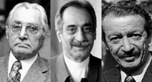 سه تن از رهبران جبهه ملی ایران دیده می شود: کریم سنجابی که