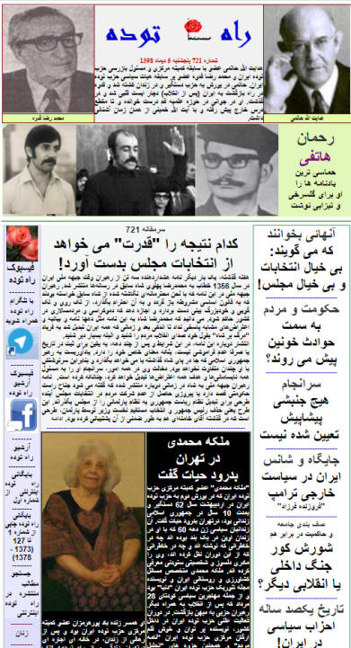 هفته نامه راه توده – شماره 721 (پنجشنبه 5 دیماه 98)- منتشر شد و مطالب آن علاوه بر سایت این نشریه، روی فیسبوک و کانال تلگرام این  نشریه نیز قرار گرفت. سرمقاله این شماره به انتخابات مجلس آینده اختصاص دارد. علاوه بر دو یادنامه برای  خسرو گلسرخی و هوشنگ تیزابی به قلم رحمان هاتفی، دراین شماره مطالبی با عناوین زیر می خوانید: آنهائی بخوانند که می گویند: بی خیال انتخابات و بی خیال مجلس!، حکومت و مردم به سمت حوادث خونین پیش می روند؟، سرانجام هیچ جنبشی پیشاپیش تعیین شده نیست، شورش کور، جنگ داخلی و یا انقلابی دیگر؟ تاریخ یکصد ساله احزاب سیاسی در ایران، پابرهنه ها و بیکاران قربانیان نئولیبرالیسم اقتصادی در جمهوری اسلامی، اقبال تاریخی خلقها برای یافتن راههای نوین تحولات (مارکسیسم و شرق)، نسل امروز  الجزایر افتخارات جنگ آزادیخبش را به تاریخ سپرده، بازگشت ارتش انگلیس به دوران استعماری و بالاخره اعلام درگذشت "ملکه محمدی" عضو کمیته مرکزی حزب توده ایران در تهران.