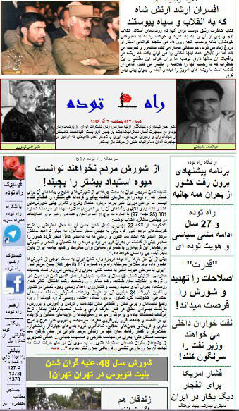 هفته نامه راه توده - شماره 717 (پنجشنبه 7 آذرماه 1398) منتشر شد و مطالب آن علاوه بر سایت این نشریه، روز فیسبوک و کانال تلگرام آن نیز قرار گرفت. سرمقاله این شماره اختصاص به تفسیر شورش اخیر مردم و پیش بینی آن در سرمقاله های این نشریه در طول دو سال اخیر دارد.