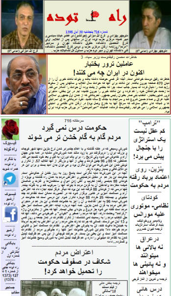 هفته نامه راه توده - شماره 716 (پنجشنبه 30 آبان 98) منتشر شد و مطالب آن روی فیسبوک و کانال تلگرام این نشریه قرار گرفت. سرمقاله این شماره اختصاص به جمعبندی شورش اخیر مردم ایران علیه فساد و گرانی و فشارهای اجتماعی حکومت به مردم دارد که به بهانه سهمیه بندی بنزین در خیابانها ظاهر شد.