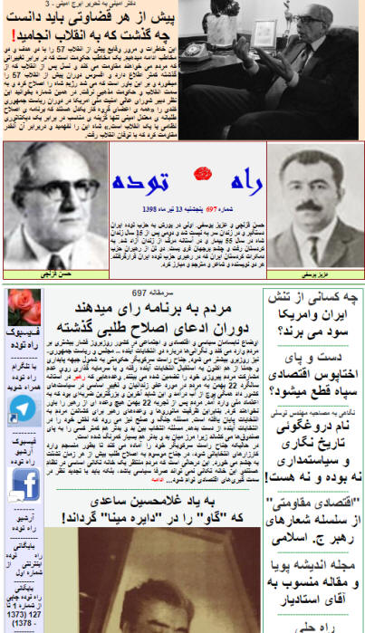 هفته نامه راه توده – شماره 697 (پنجشنبه 13 تیر 98) منتنشر شد و مطالب آن علاوه بر سایت این نشریه روی فیسبوک و کانال تلگرام آن نیز قرار گرفت. سرمقاله این شماره اختصاص به بی برنامگی اصلاح طلبان برای شرکت  در انتخابات مجلس و ریاست جمهوری دارد و بر این نکته تاکید شده که تا برنامه منسجم اقتصادی و سیاسی اعلام نشود و همچنان به کلی گوئی های گذشته ادامه داده شود، مردم به اصلاح طلبان نیز همان نگاهی را خواهند داشت که به باصطلاح اصولگرایان دارند.