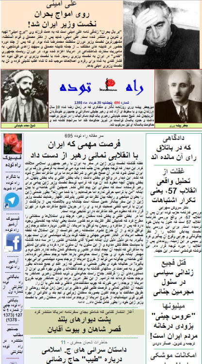 شماره جدید هفته نامه راه توده با شماره 695 (پنجشنبه 30 خرداد) منتشر شد و مطالب آن علاوه بر سایت این نشریه، روی فیسبوک و کانال تلگرام آن نیز قرار گرفت. سرمقاله این شماره به از کف دادن فرصت اعلام نظرات و شرایط ایران برای مذاکره با امریکا از سوی رهبر جمهوری اسلامی اختصاص دارد. با پایان روزشماره رویدادهای ایران از انقلاب مشروطه تا انقلاب بهمن 57، از این شماره بخش هائی از کتاب فرزند علی امینی درباره یادمانده های پدرش را منتشر خواهیم کرد که بخش اول آن را در همین شماره می خوانید. از دیگر مقالات این شماره: نگاهی به دادگاه محمد رضا خاتمی در باره تقلب در انتخابات 88، غفلت از تحلیل واقعی انقلاب 57، یعنی تکرار اشتباهات، قتل فجیع یک زندانی سیاسی در سلول مجرمین در زندان فشافویه، غول "هاوای" که چینی ها از شیشه در آورده اند، امکانات موشکی ایران برای دفاع در برابر حمله نظامی، کشتار 9 زندانی سیاسی در تپه های اوین در زمان شاه، روسیه ستیزی چرا استراتژی امریکاست؟ بخش دیگری از خاطرات شعبان جعفری و بالاخره آغاز انتشار کتابی که احمد شاملو از کتاب قطور خاطرات اعتمادالسلطنه وزیر دربار ناصرالدین شاه منتشر کرد.