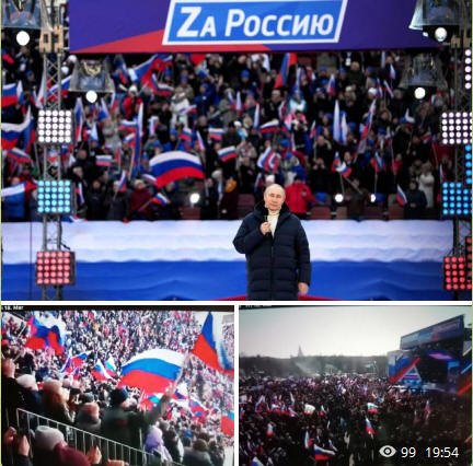 پوتین نیز روز گذشته، با  اطمینان از محبوبیتش در میان مردم، در جشن سالگرد پیوستن کریمه به روسیه که در یک ورزشگاه بر پاشده بود حاضر شد و براى هزاران نفر سخنرانى کرد. به گزارش رسانه های روسیه در این همایش بیش از ۲۰۰ هزار نفر شرکت کردند.  پوتین گفت تمامی اهداف کرملین در "عملیات ویژه نظامی" در اوکراین محقق خواهد شد.