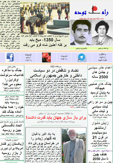 هفته نامه راه توده - شماره ۹۲۲ (چهارشنبه ۲۳ اسفند ۱۴۰۲) - منتنشر شد و مطالب آن علاوه بر سایت این نشریه، روی فیسبوک و کانال تلگرام راه توده نیز قرار گرفت. سرمقاله این شماره اختصاص به تضاد و تناقض دو سیاست داخلی و خارجی در جمهوری اسلامی دارد. گزارش ویژه نیز در ارتباط با جشنهای ۲۵۰۰ ساله شاهنشاهی و اوج گیری اعدام ها و دستگیری ها و زندانی کردن سیاسیون و فعالان جنبش چریکی. در همین شماره مطالب دیگری می خوانید با عناوین زیر: