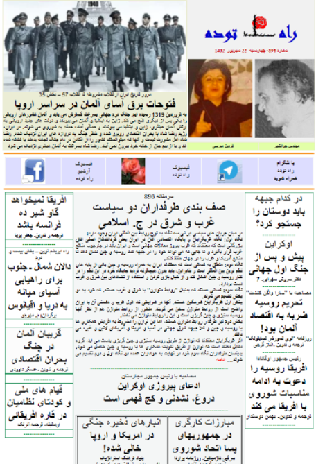 هفته نامه راه توده - شماره ۸۹۶ (چهارشنبه ۲۲ شهریور) منتشر شد و مطالب آن علاوه بر سایت این نشریه، روی تلگرام و فیسبوک راه توده نیز قرار گرفت. سرمقاله این شماره اختصاص به دسته بندی طیف طرفداران غرب و مدافعان گردش به شرق در جمهوری اسلامی دارد. گزارش ویژه نیز ادامه مرور رویدادهای ایران از انقلاب مشروطه تا انقلاب ۵۷ است که رسیده ایم به یکسال و نیم قبل از سقوط رژیم رضاشاه. در همین شماره مطالب دیگری می خوانید با عناوین زیر: