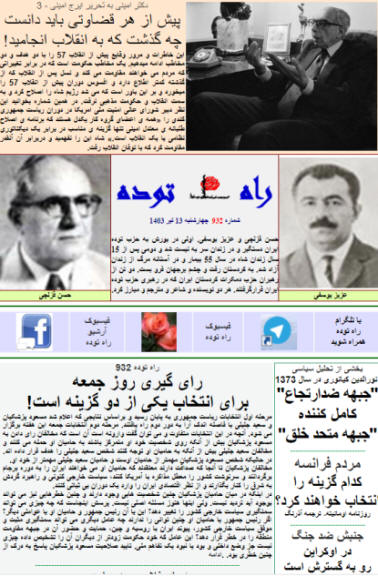 هفته نامه راه توده - شماره ۹۳۲ (چهارشنبه ۱۳ تیر ۱۴۰۳)- منتشر شد و مطالب آن علاوه بر سایت این نشریه، روی فیسبوک و کانال تلگرام راه توده نیز قرار گرفت. سرمقاله این شماره به تحلیل دو نتیجه از دور دوم انتخابات ریاست جمهوری اختصاص دارد. گزارش ویژه، بخش سوم از خاطرات علی امینی نخست وزیر اصلاح طلب رژیم شاه در آغاز دهه ۱۲۴۰ است. در همین شماره مطالب دیگری می خوانید با عناوین زیر: